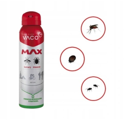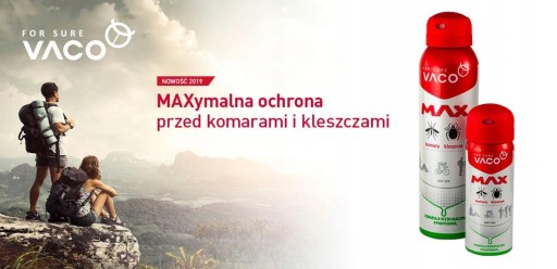 VACO Spray MAX to aerozol przeznaczony do odstraszania komarów, meszek i kleszczy do stosowania na odzież. Okres działania odstraszającego wynosi aż 8h! W celu zapewnienia ochrony przeciwko kleszczom przed dłuższy czas.