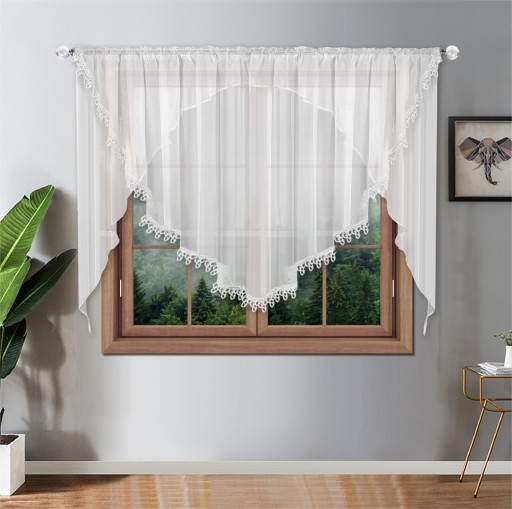 Firanka składa się z dwóch część zszytych razem na jednej taśmie marszczącej zakrywając tym samym część okienną dwoma warstwami woalu. Firanka wykończona została doskonałą śnieżnobiałą gipiurą o szerokości 8cm tym samym tworząc wyjątkowy i klasyczny klimat w każdym pomieszczeniu. Doskonały przezroczysty woal będzie pięknie wyglądał w Państwa domu