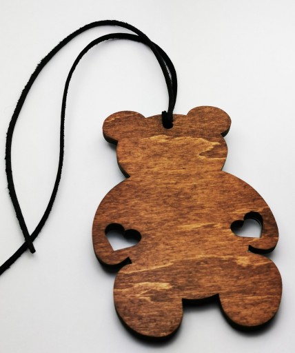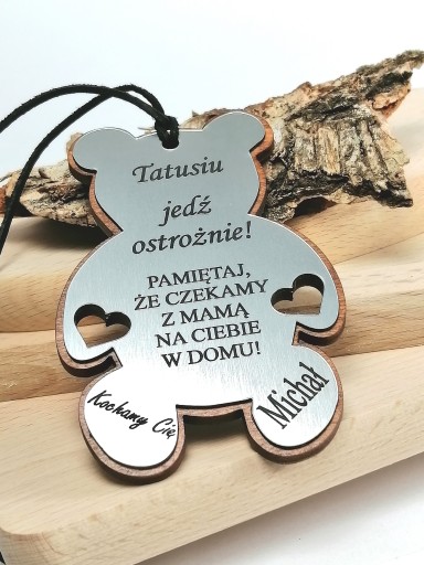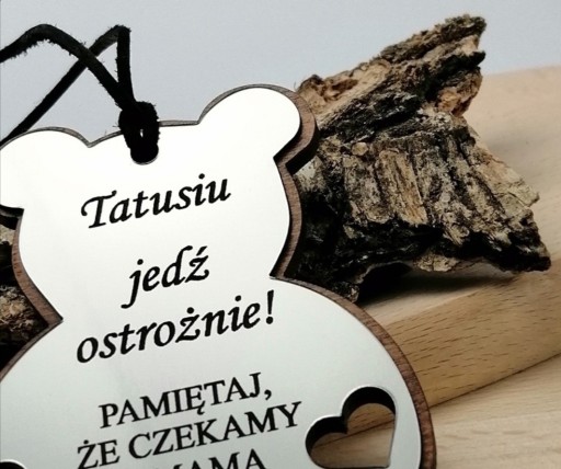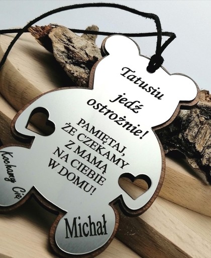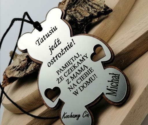 Zawieszka wykonana jest ze sklejki brzozowej, bejcowanej i zabezpieczonej lakierem ekologicznym, a strona zewnętrzna pokryta jest laminatem w kolorze srebrnym. Na laminacie został wygrawerowany napis , oraz imiona osób bliskich, które czekają na kierowcę w domu. Grawerowanie jest metodą trwałą i nie ulegnie zmazaniu. Do zawieszki dołączony jest rzemyk ze skóry naturalnej (kolor dobieramy losowo).