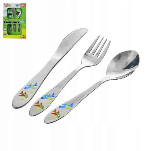 НАБОР СТОЛОВЫХ ПРИБОРОВ ДЕТСКИЙ, 3 шт. СТАЛЬНЫЕ АВИАЦИОННЫЕ САМОЛЕТЫ