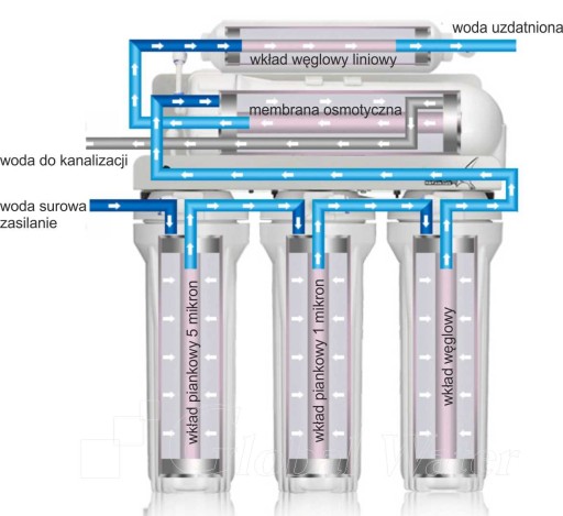 Etapy filtracji wody pitnej w filtrze odwróconej osmozy RO5: