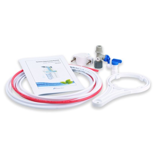 Wszystkie niezbędne podzespoły, komplet przewodów, zawory i szybkozłączki, klucz do obudowy filtrów, przyłącze wody 3/8", zawór kulowy, przyłącze do kanalizacji.