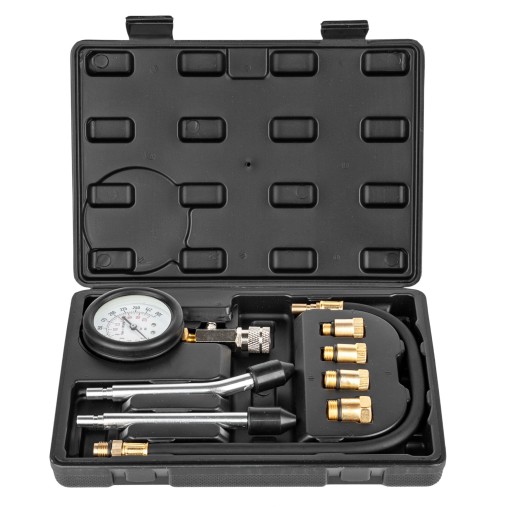 Tester do kontroli ciśnienia sprężania w cylindrach silników benzynowych z wyposażeniem poszerzającym jego możliwości. W walizce plastikowej znajduje się manometr z zaworem, przedłużka prosta i zagięta, przedłużający wąż ciśnieniowy oraz 4 adaptery do podłączenia do cylindrów. Części są wyposażone w szybkozłącza do łatwego i szybkiego zamontowania.