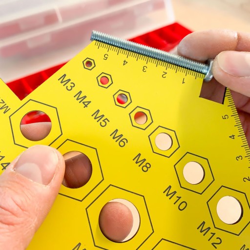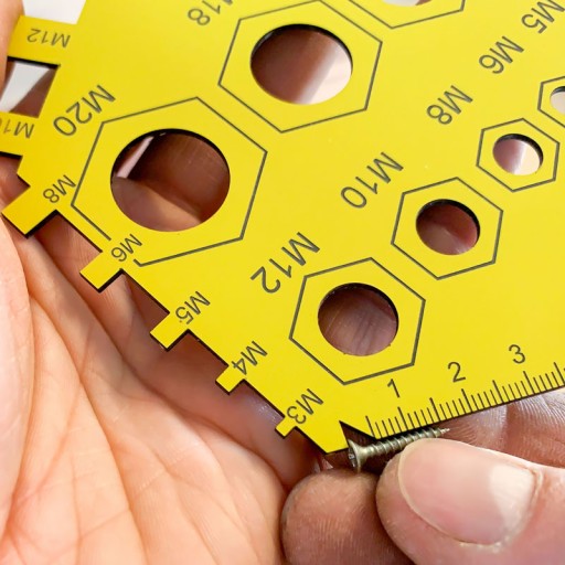 Przyrząd idealnie sprawdza się do mierzenia średnic śrub oraz nakrętek. Szablon wykonany jest z tworzywa o grubości 1,6 mm. Zakres pomiaru śrub oraz nakrętek od M3 do M20. Na szablonie znajdują się wyraźne oznaczenia średnic otworów wypalone laserowe co znacząco zwiększa ich odporność na ścieranie. Narzędzie posiada miarkę ułatwiającą zmierzenie długości śrub lub wkrętów. Szablon może również służyć do zaznaczania miejsca pod wiercony otwór.