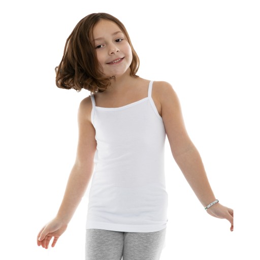 Dziewczęca podkoszulka na wąskich ramiączkach, która jest bardzo wygodna. Koszulka jest gładka, co daje jej bardzo estetyczny wygląd i sprawia, że pasuje pod każdą część garderoby.