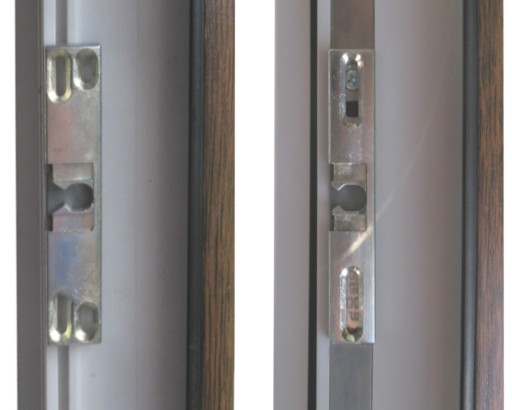 Po lewej zatrzask do słupka stałego (futryna z rowkiem) - po prawej zatrzask do słupka ruchomego (futryna z metalową listwą)
