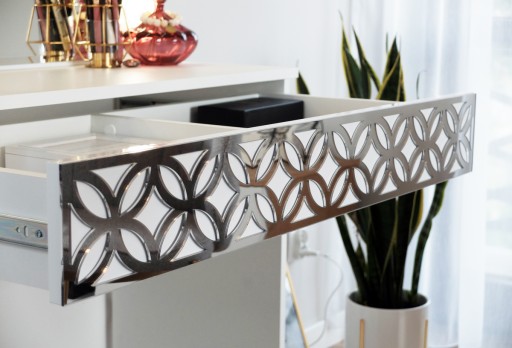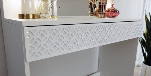TOALETKA podsiada lustrzany dekor na froncie szuflady.