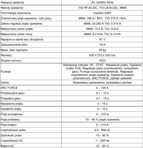 Cyfrowa spawarka DIGITIG 315 AC/DC MULTIPRO jest urządzeniem najnowszej generacji, przeznaczonym do zastosowań profesjonalnych. Wykonana jest w technologii IGBT i wyposażona w sterowanie cyfrowe. Służy do spawania ręcznego metodą TIG HF oraz TIG Lift stali i metali kolorowych prądem stałym oraz przemiennym. Urządzenie wyposażone jest w opcję spawania metodą MMA (elektrodą otuloną). Spawarka umożliwia pełną cyfrową regulację i sterowanie parametrami spawalniczymi charakterystyki łuku oraz pulsu a także wybór kształtu fali prądu AC. Posiada zajarzanie HF, funkcję ARC FORCE, przełącznik 2T/4T i wyświetlacz wskazujący prąd spawania i zestawy pamięci. Urządzenie posiada pamięć ostatniego ustawienia, czyli po jej wyłączeniu i ponownym załączeniu przywracane są ostatnio ustawione parametry. Istnieje także możliwość zapamiętania 20 zestawów ustawień parametrów pulsu i prądu spawania. W komplecie znajduje się uchwyt spawalniczy TIG chłodzony cieczą, przewód elektrodowy oraz przewód masowy.