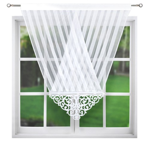 Panel okienny dekoracyjny typu V-ka wykonany z półprzezroczystego woalu i markizety ozdobionego panelem. U góry został wszyty tunel, umożliwiający łatwy montaż bezpośrednio na karniszu rurkowym bądź na żabkach, ozdobiony pasem z cyrkonii. U dołu znajduje się stylowy panel również obszyty cyrkoniami. Góra zdobiona kryształem.