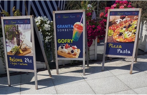 tablica potykacza wykonana z czarnej płyty HDF tak, aby mogli Państwo bezproblemowo na niej pisać, to co na chwilę obecną chcą Państwo zaproponować przechodniom.