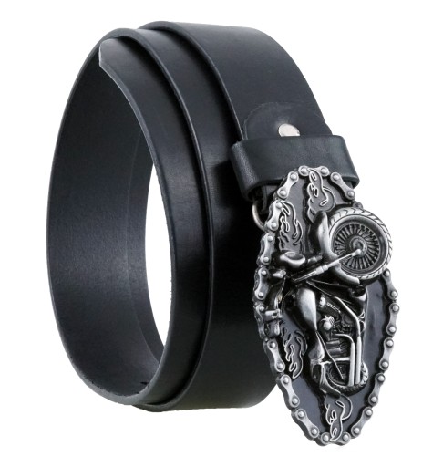 Czarny pasek to połączenie stylu elegancji i swobody w którym odnajdzie się zarówno płeć męska jak żeńska. Pasek posiada piękną metalową klamrę z motywem motocykla otoczonego łańcuchem na czarnym tle co dodaje mu oryginalności i niepowtarzalności wzoru. Idealny dla fanów dwóch kółek.