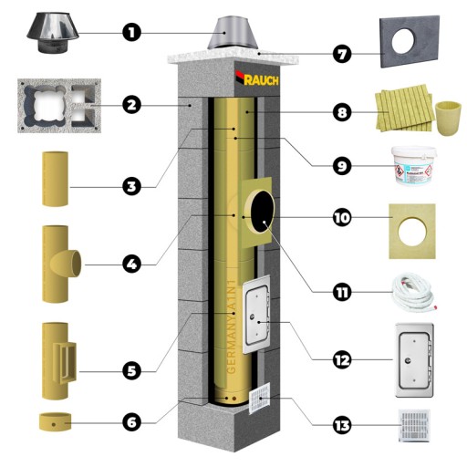 Komin RAUCH UNIWERSAL posiada wszystkie niezbędne elementy do jego montażu, które zostały wyszczególnione na schemacie