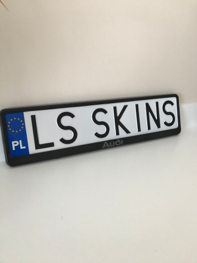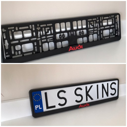 Aukcja dotyczy ramki tablicy rejestracyjnej UE koloru czarnego z napisem AUDI w kolorach do wyboru