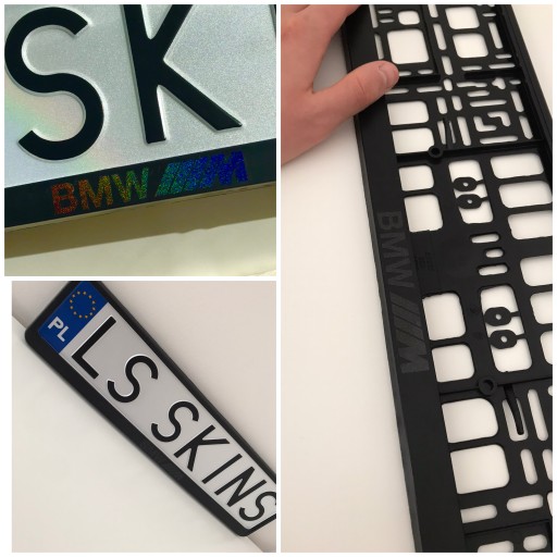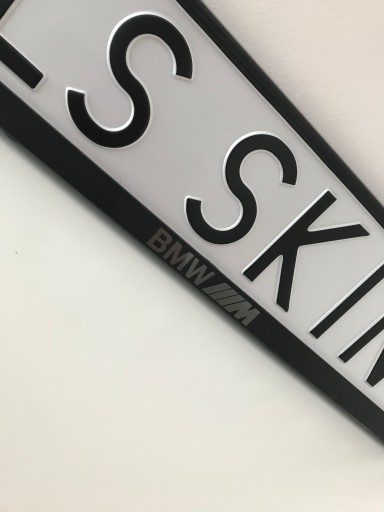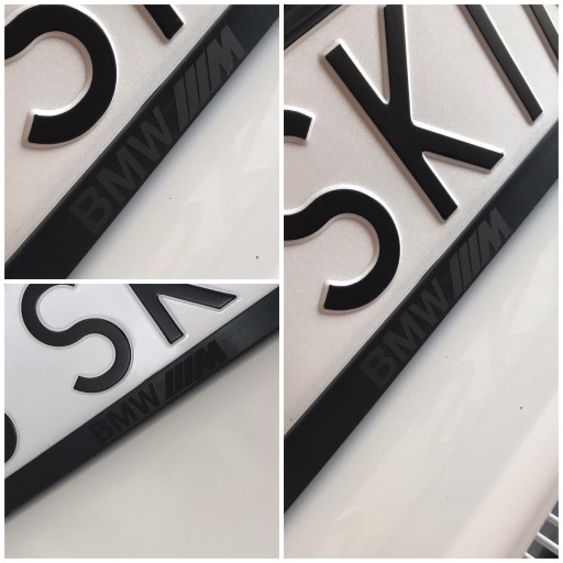 Aukcja dotyczy ramki tablicy rejestracyjnej UE koloru czarnego z napisem BMW M w kolorach do wyboru