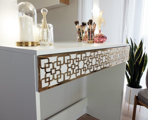 TOALETKA podsiada lustrzany dekor na froncie szuflady.
