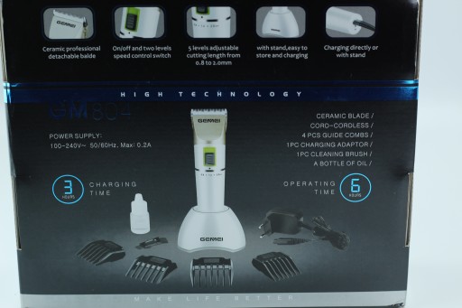 Maszynka doskonale sprawdzi się w salonie fryzjerskim lub w salonie barberskim. Nowoczesna i wyjątkowo elegancka maszynka bezprzewodowa GEMEI PROFESSIONAL to wysokiej jakości sprzęt, który doskonale sprawdzi się w użytku domowym i profesjonalnym. Jej największą zaletą jest w szybki i mocny silnik DC, który osiąga prędkość 10 000 obr/min. Sprzęt wyposażony jest w wysokiej jakości ostrze, które wykonane są ze stali nierdzewnej, która wyróżnia się podwyższoną odpornością na podgrzewanie i tępienie. Dzięki temu jest dużo bardziej odporne na użytkowanie, zwłaszcza w porównaniu z ostrzami ze stali tradycyjnej. Dzięki akumulatorowi litowemu maszynka może pracować aż 6 godzin bez przerwy. Bateria jest gotowa do użycia już po 180 minutach ładowania. Do zestawu dołączone są grzebieniowe nakładki dystansujące, które mocowane są na magnesach, więc z łatwością można je ściągać i wymieniać. Maszynka zwraca również uwagę swoim nowoczesnym designem – prostota i elegancja to mocne strony tego urządzenia.