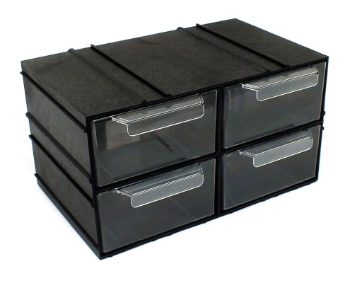 Modułowy system szufladek pozwalający budować zestawy, ścianki, złożone z czterech wielkości szufladek. Obudowa wykonana z polistyrenu ma zawsze ten sam wymiar zewnętrzny. System rowków pozwala łączyć moduły miedzy sobą. Wnętrze jest podzielone tak ze można w nie włożyć dwie, cztery, sześć lub dwanaście szufladek