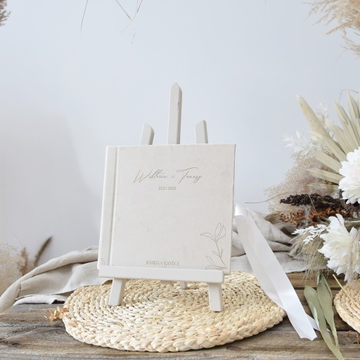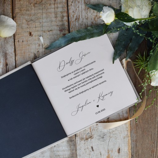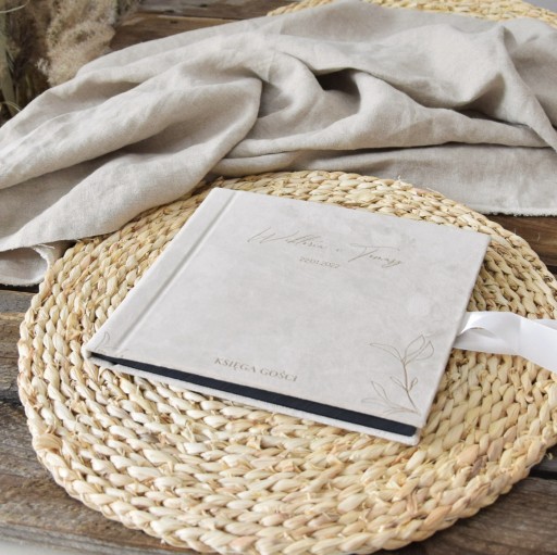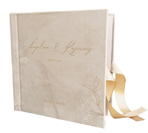 Welurowa, spersonalizowana okładka, grawerowane napisy, piękna wstążeczka i kartki czekające na słowa Waszych gości.