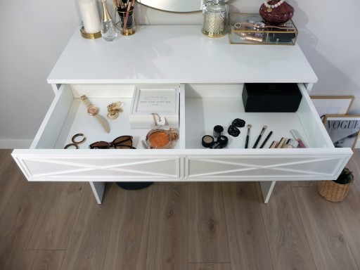 Toaletka wykonana jest z białej płyty laminowanej. Front szuflady - płyta połysk.
