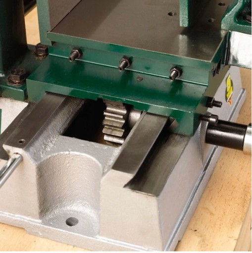 Stół dłutarki wykonany jest z precyzyjnie przygotowanego odlewu. Płynny, nie wymagający wysiłku przesuw stołu po prowadnicach na jaskółczy ogon w kierunku przód-tył oraz na boki.
