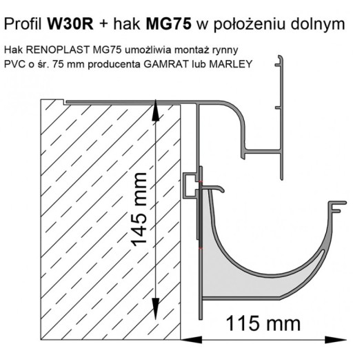 Uchwyt rynnowy dostosowany do montażu w profilach okapowych Renoplast K40, K60, W30R.
