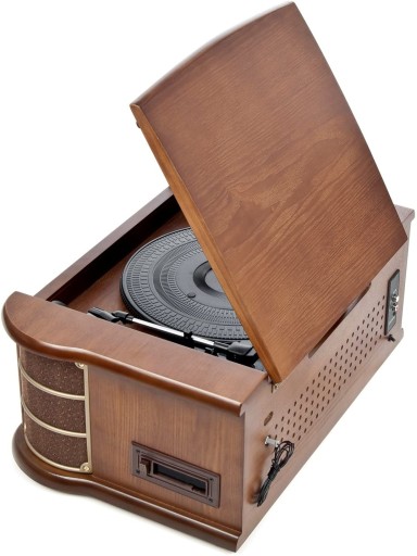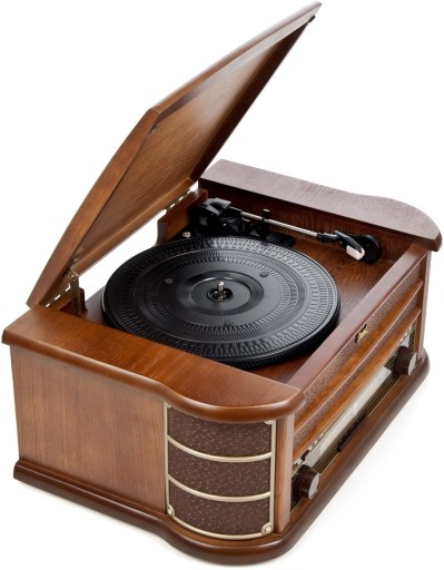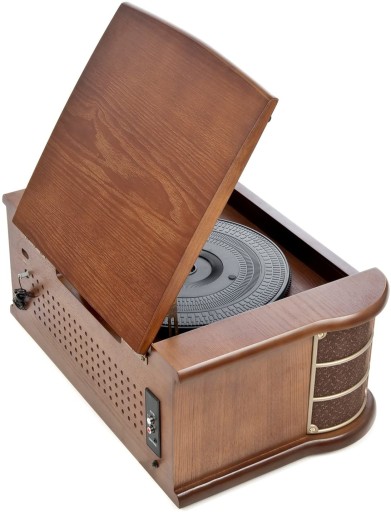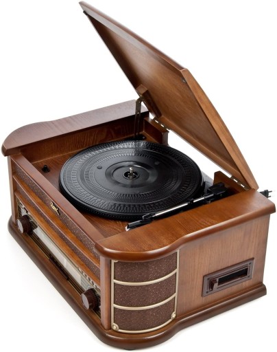 Centrum muzyczne Nostalgia z gramofonem (33, 45, 78 rpm) odtwarzacz CD (MP3), odtwarzacz kasetowy, radio FM / AM, wejście AUX i port USB.