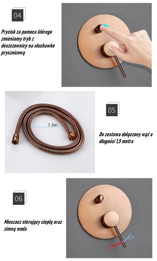 Dopełnieniem całości jest słuchawka prysznicowa. Jest ona dopasowana designem do całości zestawu. W zestawie znajduje się także wąż prysznicowy o długości 1,5m.