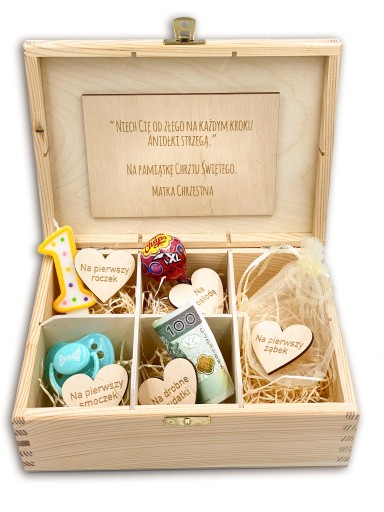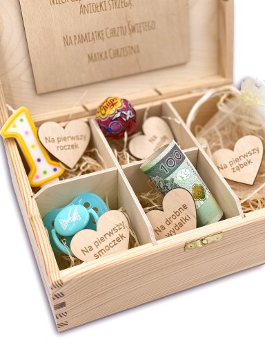 Oferujemy drewniane pudełko wspomnień z przegródkami jako wyjątkowy prezent na chrzest, roczek lub inną okazję.