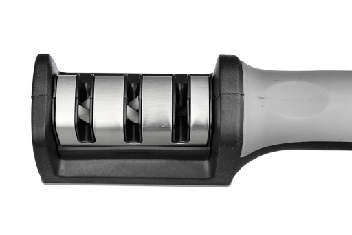 Ostrzałka do noży trzyszczelinowa wyposażona w antypoślizgową, gumową podstawę oraz ergonomiczny uchwyt pomagający zachować stabilizacje podczas ostrzenia. Trzy etapy ostrzenia oferują możliwość naostrzenia bardzo tępych lub uszkodzonych krawędzi oraz podostrzenie już wyprofilowanych ostrzy.