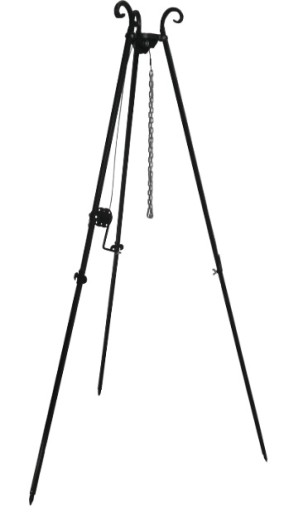 Trójnóg wyposażony jest w kołowrotek do regulacji wysokości rusztu lub kociołka.