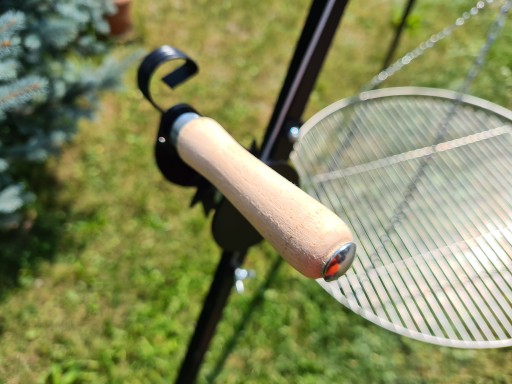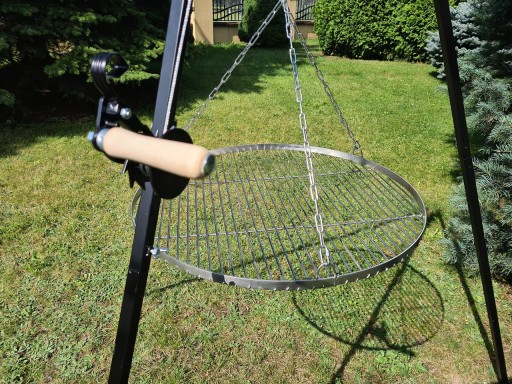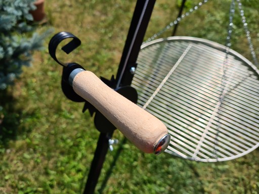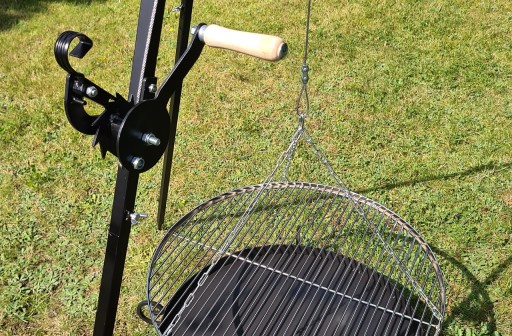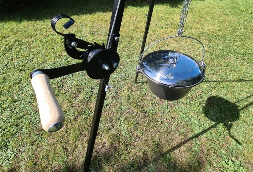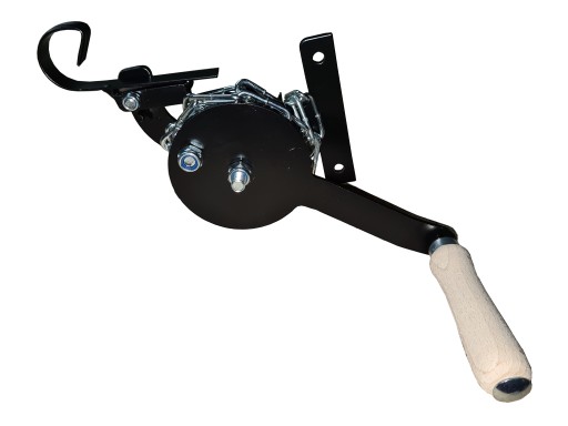 Kołowrotek idealnie nadaję się np: do zastosowania w trójnogach. Zapadka ułatwia ustawienie kołowrotka w odpowiedniej pozycji. Posiada on wygodną drewnianą rączkę. W komplecie znajduje linka, łańcuchy oraz karabińczyki.