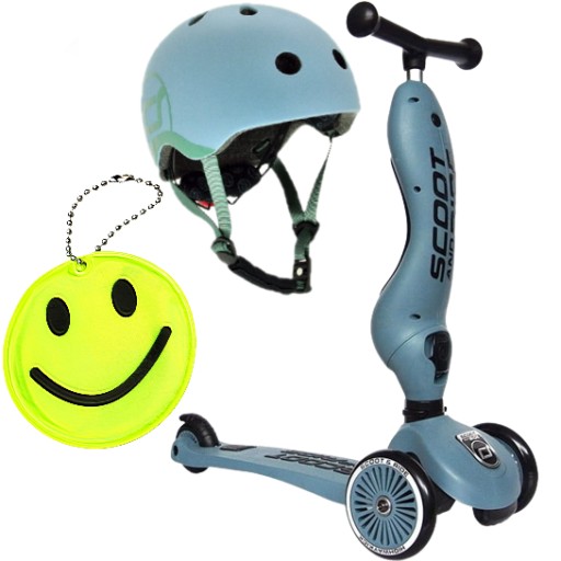 - spójny kolorystycznie z pastelową kolekcją Highwaykick – na kremowoszarej skorupie (w kolorze Steel), znajdują się trzy kolorowe paski w pastelowych kolorach: różowym, niebieskim i zielonym (Rose, Steel i Forest), wykonane w technologii premium, zapewniającą ich wyjątkową trwałość, po bokach kasku znajduje się niebieskie logo Scoot&Ride, niebieskie taśmy regulujące z białym nadrukiem