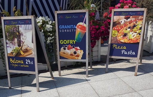 Tablica potykacza wykonana z czarnej płyty HDF tak, aby mogli Państwo bezproblemowo na niej pisać, to co na chwilę obecną chcą Państwo zaproponować przechodniom.