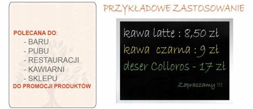 Tablice kredowe reklamowe posiadają wiele zastosowań w : sklepach, barach, pubach, biurach, gastronomi, sklepach odzieżowych