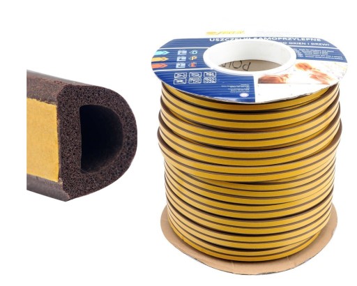 Uszczelka samoprzylepna do okien i drzwi typu D, kolor brązowy. Wymiary 9,0x7,5mm. Pakowana na rolce 100m. Wykonana z gumy EPDM, która charakteryzuje się bardzo dobrą odpornością na działanie warunków atmosferycznych, promieniowania słonecznego UV, tlenu czy wody. Posiadają warstwę samoprzylepną wzmocnioną siatką z włókna szklanego. Uszczelki samoprzylepne zapewniają skuteczną ochronę przed zimmnem, wiatrem, ciepłem, hałasem, deszczem czy insektami. Pozwalają oszczędzić energię do 35%. Przeznaczone do stosowania w szczelinach o wymiarach 3,0~7,0mm.
