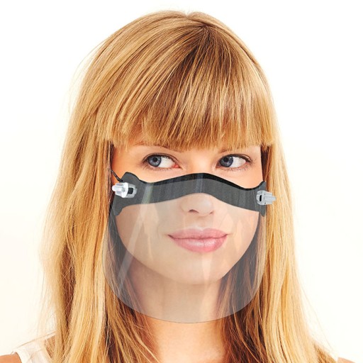 Maseczka z elementem regulacyjnym, umożliwia dostosowanie przyłbicy do twarzy. Dzięki przezroczystym śrubom i otworom w szybce poliestrowej można dopasować przyłbicę do twarzy. Lekka i wygodna przyłbica ochronna na usta i nos (wyłączając oczy). Łączy w sobie zarówno wygodę maseczki jak i dzięki przeźroczystości spełnia funkcję przyłbicy. Produkt wielokrotnego użytku, wykonany z szybki poliestrowej 200-300gr oraz mocnej pianki będącej elementem konstrukcyjnym. Mocowana za pomocą czarnych gumek za uszami.