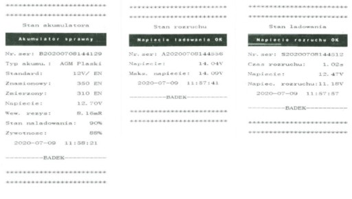 - stanu naładowania akumulatora oraz zdolności uruchamiania akumulatorów 12V, używanych w pojazdach (TEST AKUMULATORA)