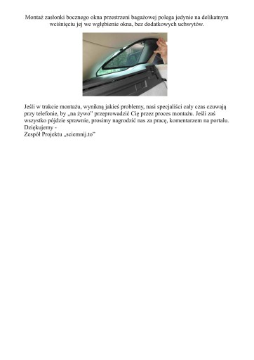 Montaż oferowanych zasłonek jest wyjątkowo prosty i intuicyjny oraz co najważniejsze NIE wymaga wiercenia, klejenia, przykręcania bądź podobnej ingerencji w konstrukcję auta. Jest całkowicie "bezinwazyjny", a zdemontowane zasłonki nie pozostawiają śladów ich użytkowania w samochodzie.