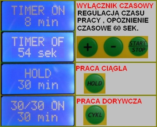 - duży czytelny wyświetlacz 2 wierszowy (niebieski lub zielony)(wiersz górny opisuje załączoną funkcjewiersz dolny odlicza czas)