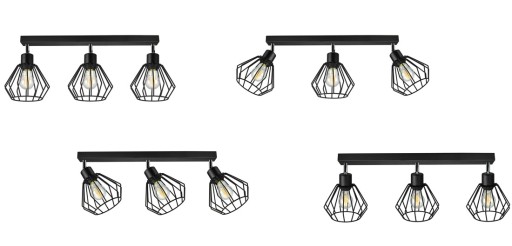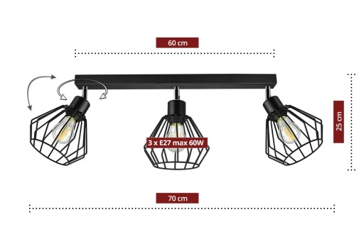 Nowoczesna lampa - plafon - wyposażona w trzy metalowe, ruchome klosze wykonane z drutu w stylu edison.