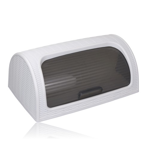 Nowoczesny i oryginalny chlebak w kolorze białym z pokrywą prążkowaną w kolorze przydymionej szarości. Chlebak został wykonany z wysokiej jakości tworzywa sztucznego.