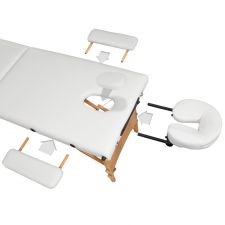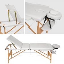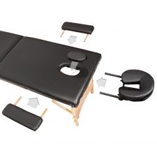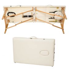 Stół do masażu z wyściółką o grubości 3 cm i drewnianą ramą. Stół do masażu jest gotowy do użycia w kilka sekund, a dzięki szybkiemu i łatwemu systemowi składania zapewnia oszczędność miejsca i transport. Dołączona torba ułatwia również transport - mobilny masaż nie stanowi więc przeszkody. Dodatkowa funkcja regulacji dolnej części- podnóżka.