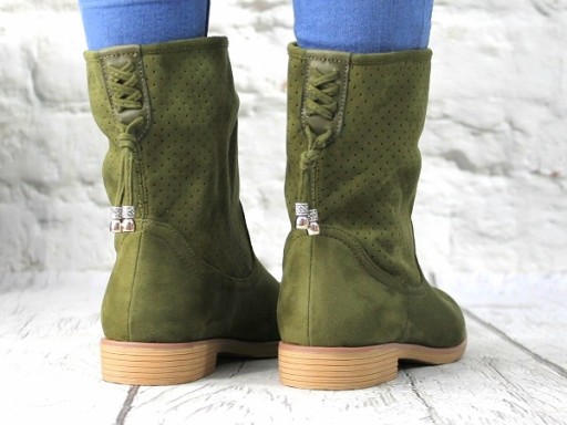 Zielone zamszowe botki to wygodna propozycja na co dzień.