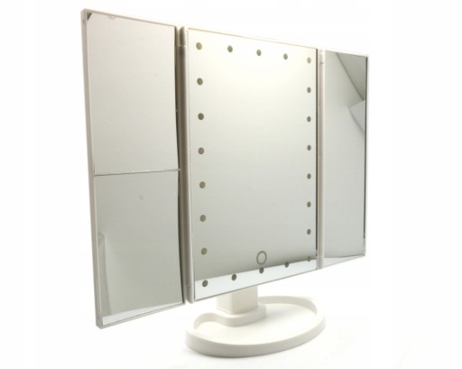 Doskonałe lusterko kosmetyczne z powiększeniem. Wyposażone w aż 22 diody doświetlające LED po zewnętrznej stronie głównego lustra. Diody LED są uruchamiane dotykowo - wystarczy kliknąć w dowolnym miejscu lusterka aby je aktywować i rozświetlić sobie przestrzeń roboczą np. w trakcie wykonywania makijażu.