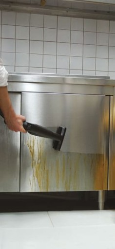 odtłuszczanie i dezynfekcja blatów szklanych, płytek i elementów stalowych;