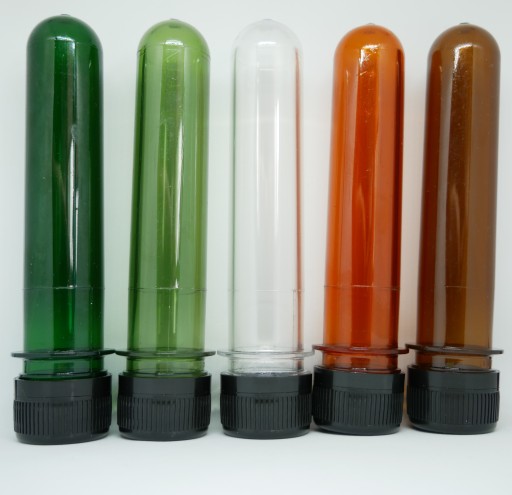 Pojemniki są w kolorze ciemno zielonym (ale transparentne) , zakrętki natomiast są czarne.