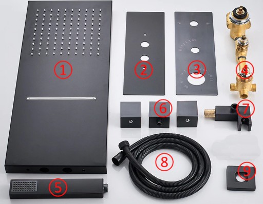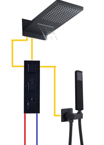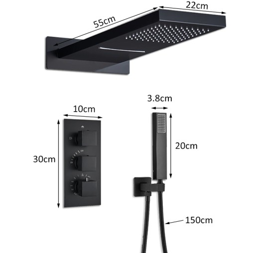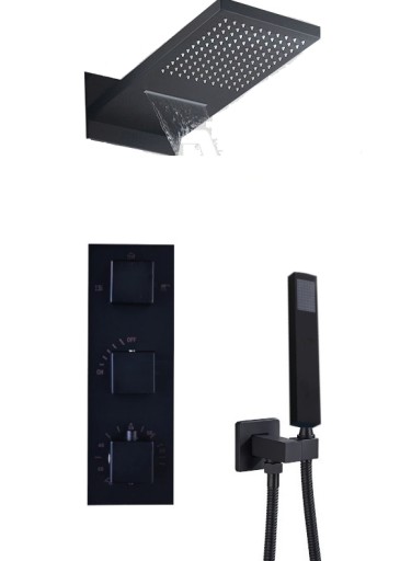 Stylowy i nowoczesny zestaw prysznicowy podtynkowy z termostatem, deszczownicą, wodospadem i słuchawką prysznicową