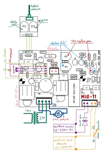 - Regulacja opóźnienia wypływu gazu. Po zakończeniu spawania (puszczeniu przycisku w rękojeści) - gaz wypływa jeszcze przez czas ustawiony potencjometrem PR-3 - w celu osłaniania gazem roztopionej spoiny, a także schładzania jej i schładzania uchwytu. Czas ten można regulować w zakresie 0,1 - ok. 4 sek. Otwarcie zaworu gazu sygnalizowane jest świeceniem żółtej diody LED L1.