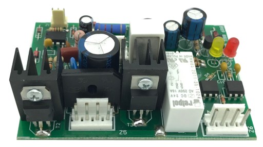 Płytka jest przystosowana TYLKO do pracy z podajnikiem 24V. Oczywiście napięcie transformatora nie musi być „precyzyjnie” 24V, może być w granicach 20 - 30V, jednak nie więcej i nie mniej. Niższe napięcie nie uruchomi układu, a może doprowadzić do uszkodzenia. Wyższe napięcie uruchomi układ i całość będzie pracowała, jednak w krótkim czasie może dojść do przegrzania układu. Zasilanie (prąd przemienny lub stały) dołączamy do pinów 2 i 3 - tak jak pokazuje schemat.