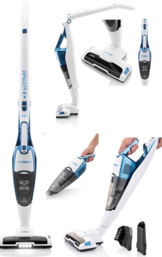 Odkurzacz pionowy Hyundai 2 w 1 z akumulatorem 14,4 V, pracujący do 25 minut po jednym naładowaniu, z dodatkowymi akcesoriami w zestawie.